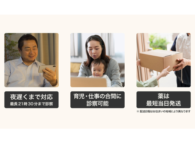 西口さん:「夜遅くまで対応してもらえて助かった」「育児の合間に診察を受けられた」「薬もすぐ届いて本当に助かった」などのお声を多く頂いています。