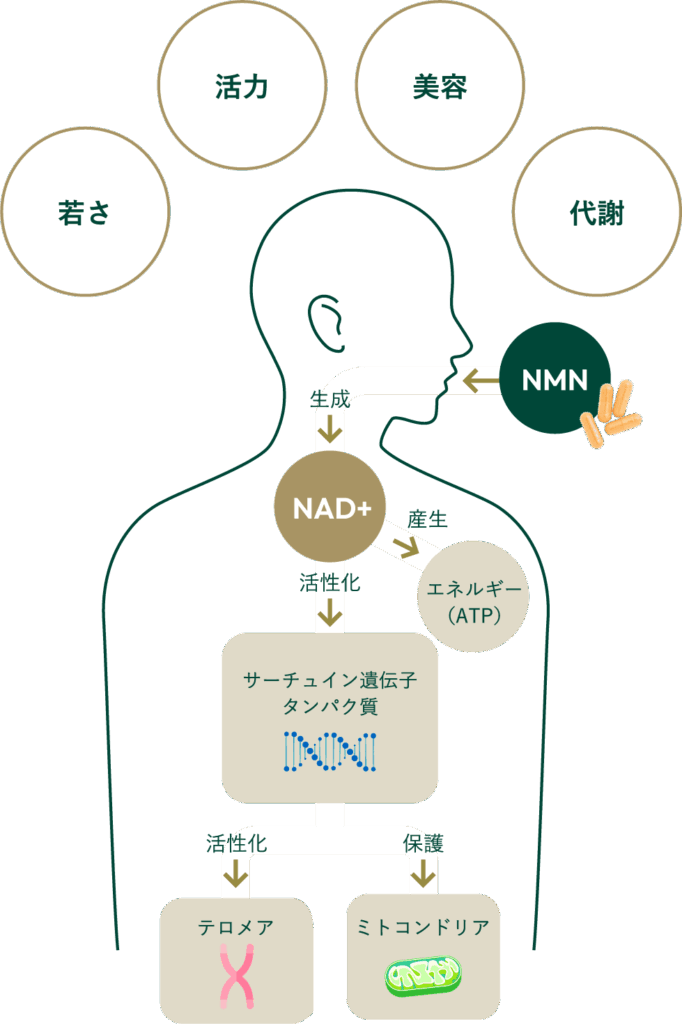 開発の際、注目したのは『細胞老化のメカニズム』です。人間の体は37兆個の細胞でできていますが、加齢にともない、細胞内の『NAD』という物質が20代後半をピークに減少していきます。