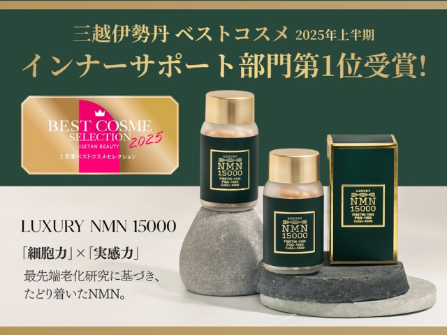 その結果、LUXURY NMN 15000は『三越伊勢丹ベストコスメセレクション2025』において『インナーサポート部門 第1位』を受賞。実際の購買データをもとに選ばれるランキングです。