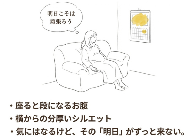 「ここ数年で増えたおなか周りの脂肪がいちばん気になります。座ったときに段になる腹、分厚くなった横からのフォルム……『明日こそは頑張ろう』と自分に言い聞かせまていますが行動が起こせなくて」