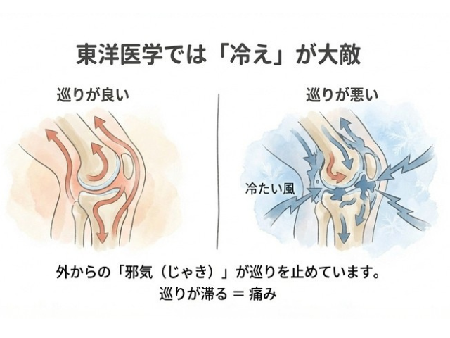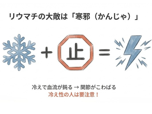 冷えは血流を滞らせ関節組織をこわばらせます。