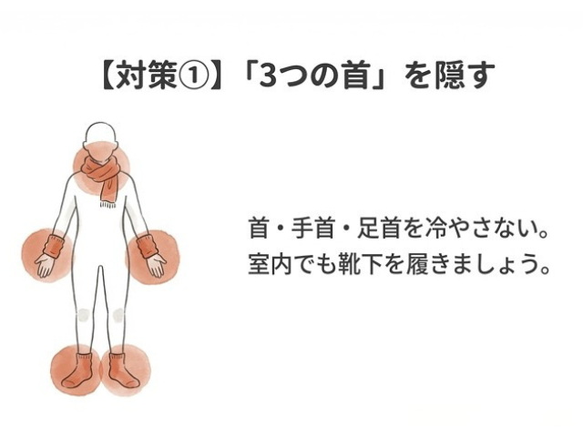 屋内でも靴下を着用し、朝夕は温かい飲み物を取り入れましょう。