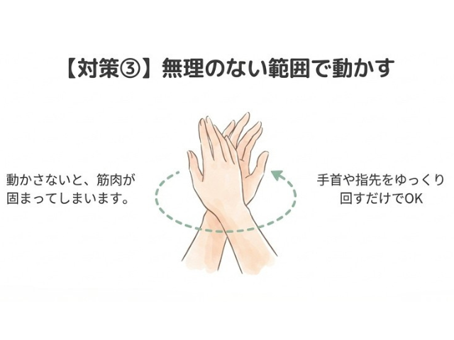 痛みが軽い日には、手首や指先をゆっくり回す、ウォーキングをするなどして、関節の可動域を維持しましょう。