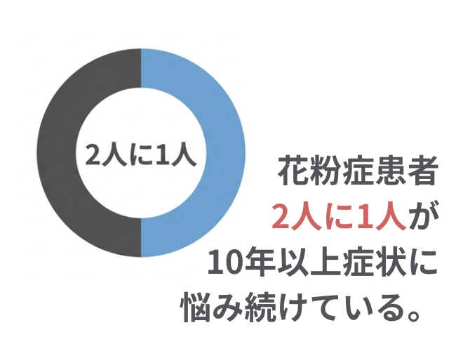 製薬会社が行った調査によると、花粉症に悩む患者さんの半数以上が、10年もの長きにわたりその症状に悩まされ続けていることがわかっています。