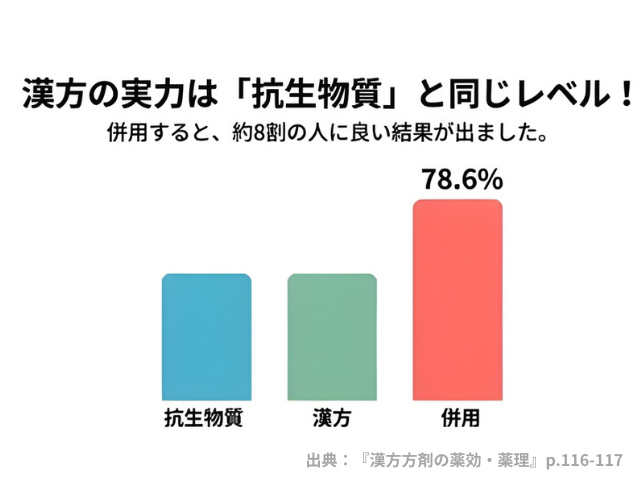 結果は、全体として見ると、漢方単独は抗生物質単独と同程度の「有用率」だったと報告されています。さらに、併用グループでは有用率が78.6%と、より高い値が得られました。