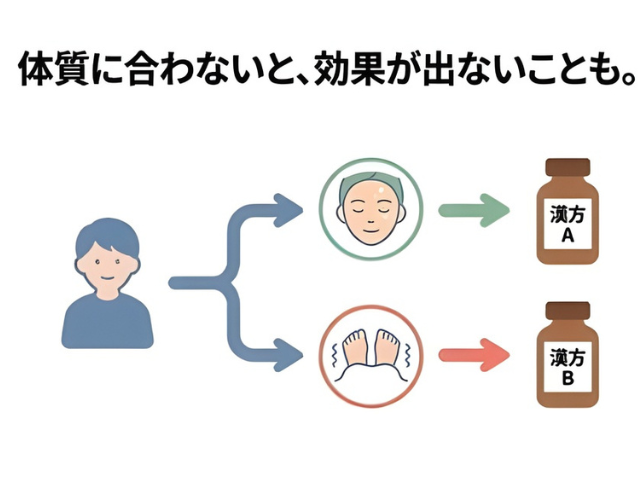 自分に合わない漢方薬を選んでしまうと、効果が半減するどころか、副作用が生じることもあるので、プロに正しく見立ててもらうことが大切です。