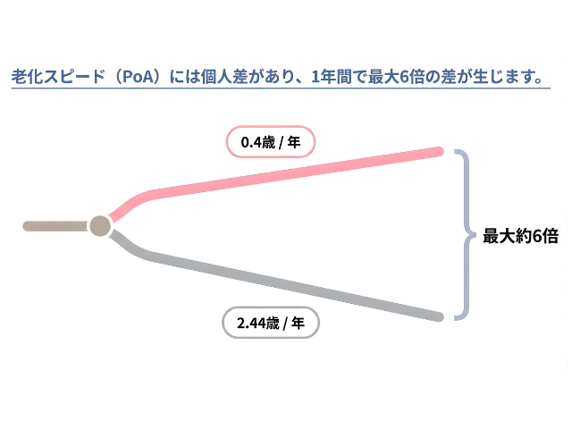 近年の研究で人の老化スピード PoA(ペース・オブ・エイジング)には個人差があり、1年間で最大「約6倍」もの差が出ることが明らかになっています。