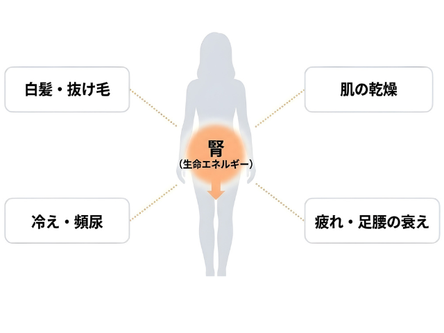 漢方医学では、老化の原因をからだの機能である「五臓」の低下と考えます。その中でもとくに老化現象に大きく関わるのが、生命エネルギーを司る「腎」の衰え。
