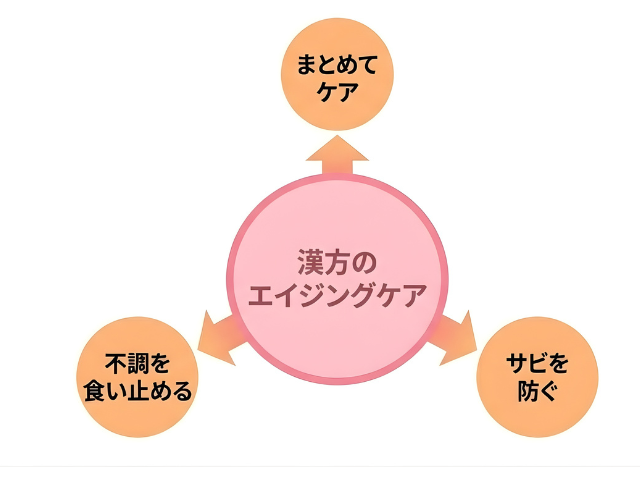 実は、エイジングケアにも、漢方薬の活用は有効といわれています。漢方薬によるエイジングケアには、以下のような大きなメリットがあります。