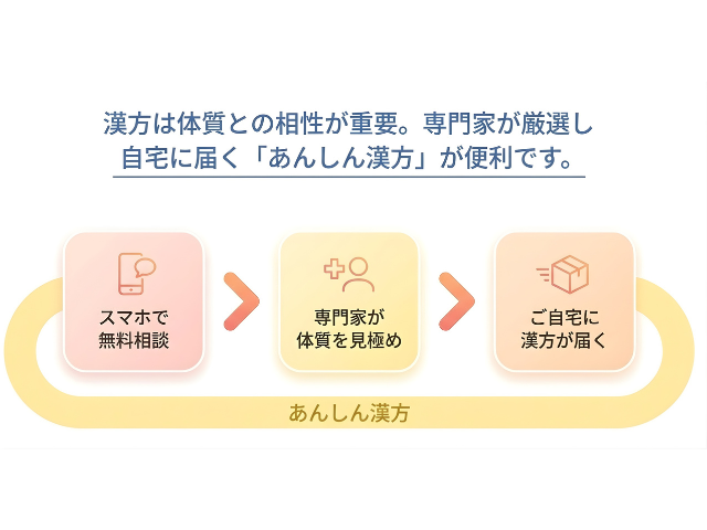 「あんしん漢方」は、漢方薬に詳しい医師や薬剤師が、あなたに最適な漢方薬を見極めてご自宅までお届けするサービスです。自分の体質や、ぴったりの漢方薬を知りたい方は、無料相談から始めてみてください。